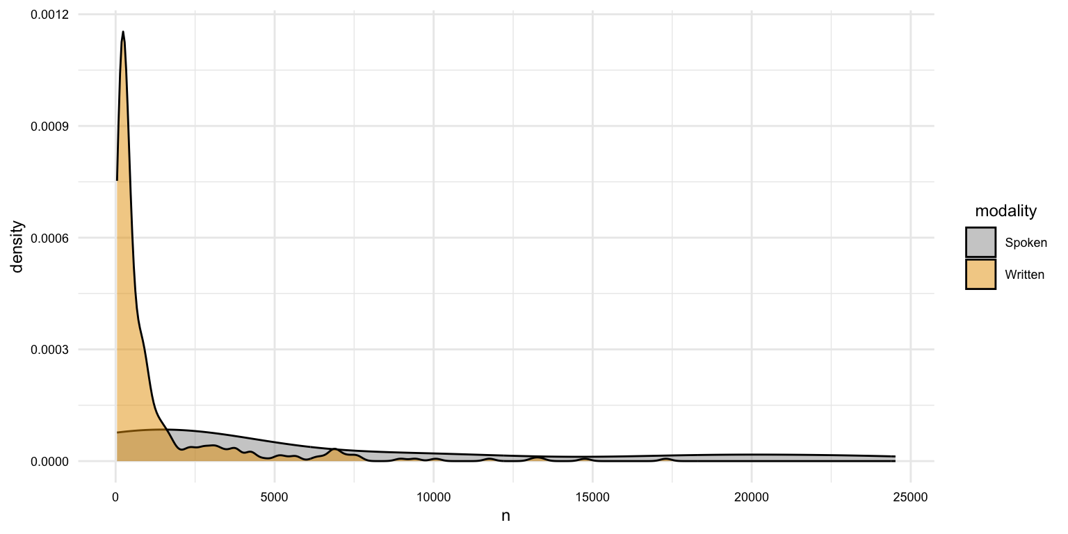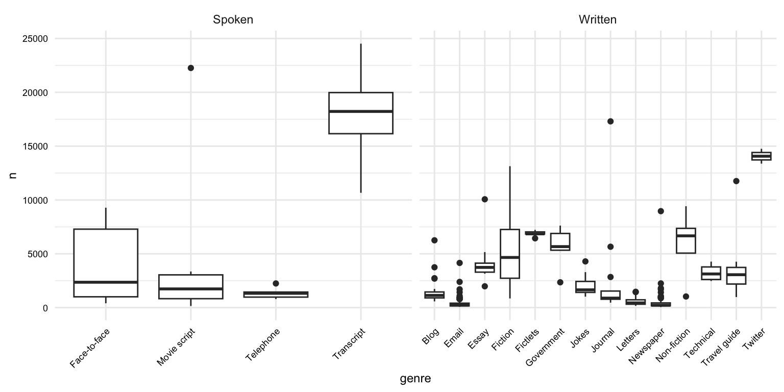 Now we want to consider how we plan to use this data in our analysis. Let's assume that we want to use this data to explore lexical variation in the MASC dataset across modalities and genres. We will want to transform the data to reflect this goal.